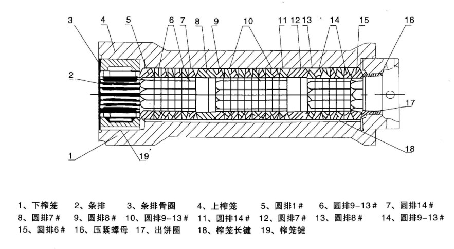 除進(jìn)料斗外,榨膛是主要的作業(yè)部分,由一根榨螺軸和圓筒榨籠組成有單級(jí)壓榨和雙級(jí)壓榨兩種形式,單級(jí)只有一個(gè)橫臥的榨膛,雙級(jí)另加一個(gè)直榨膛以進(jìn)行第一級(jí)壓榨。榨螺軸由若干個(gè)榨 螺和距圈套裝在軸上構(gòu)成。 每個(gè)榨螺有一定的螺距和螺深, 而一根軸上的各個(gè)榨螺的螺距從 進(jìn)料口到出料口逐漸縮短,螺深逐漸變淺,因此使榨膛容積從進(jìn)口到出口逐漸減小。