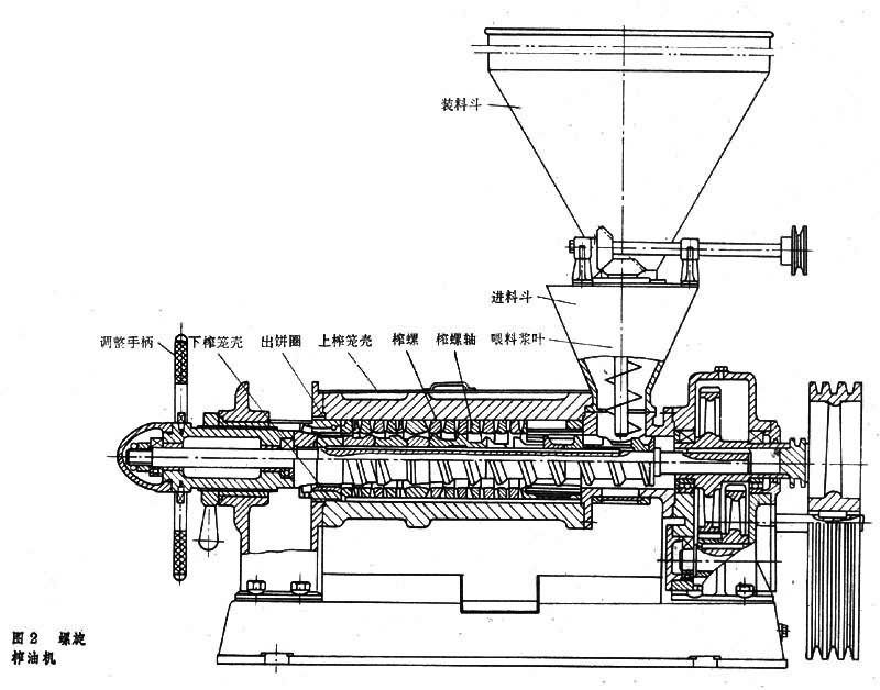 當(dāng)油料經(jīng)過(guò)喂料段的喂料螺旋進(jìn)行初步壓縮后,輸送到主壓榨段,此時(shí)榨料分裂成小粒子,逐漸形成固體塞子,使榨料有更大的表面積承受壓榨,并在初始固塞段產(chǎn)生強(qiáng)大的壓榨力。榨料受到軸向、徑向壓縮,使細(xì)胞壁破裂,油脂從榨料中被擠壓出來(lái)。榨出的油脂在初始固塞段通過(guò)榨籠縫隙流出。與此同時(shí),由于油料通過(guò)喂料斗源源不斷地喂入,榨料不斷地向前推移,沿出口壓力逐漸回落,最后經(jīng)過(guò)成餅段,通過(guò)出餅機(jī)構(gòu)將餅排除。